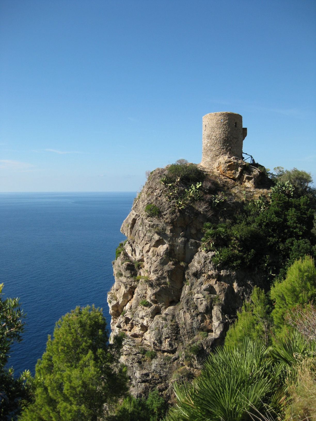 Ein neuer Tag, auch die Westküste wollen wir noch einmal unter die Räder nehmen. Wir lassen die Bikes auf der Autobahn nach Palma einmal laufen und machen einen kurzen Stopp im Hafen, wo sich Luxusjachten und Kreuzfahrtschiffe drängen. Über Andratx steigen wir wieder in die Küstenstraße ein, die von Süd nach Nord gefahren neue Eindrücke bietet. Banyalbufar und Estellencs sind zwei verträumte Dörfer an der Strecke, die zu einem Zwischenstopp einladen. Zwischen den beiden Dörfern schwebt der Wachturm gleichsam über dem Meer und ist heute der meistbesuchte Aussichtspunkt Mallorcas.