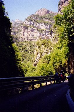 In Biescas biegen wir ab nach Osten in Richtung Torla. Über 23 Kilometer schwingen wir über die kurvenreiche Straße, die mit bestem Fahrbahnbelag grenzenloses Fahrvergnügen bietet. Torla ist das Tor zum Ordesa Nationalpark. Schweren Herzens lassen wir aber die Wanderschuhe im Koffer, auch wenn der Nationalpark dazu einlädt, die Motorräder wieder stehen zu lassen. Doch der Reiseführer hat uns mit der HU 631 zwischen Sarvisé und Escalona eine der spektakulärsten Straßen der Pyrenäen versprochen. Nun ja, die ersten 20 Kilometer erscheint uns die Straße als eine der schlechtesten der Pyrenäen. Hätten wir doch damals beim freundlichen BMW-Händler die GS ausgewählt, dann könnten wir uns über die zahlreichen Schlaglöcher und Schotterstrecken vielleicht freuen. Auch scheinen uns in der Luft hängende Leitplanken (wenn es mal welche gibt), bei denen die dazugehörige Straße schon teilweise weggebrochen ist, nicht sehr vertrauen erweckend. Doch schließlich erreichen wir den letzten Streckenabschnitt, der den Desfiladero de Vellos auf einer Länge von 12 Kilometern durchquert. In einem grandiosen Canyon fahren wir immer dicht am Bach entlang, eingezwängt zwischen riesige Felswände, die den blauen Himmel nur noch als schmalen Streifen wiedergeben. Grandios! Im Juli und August ist die Straße Einbahnstraße, was wir auch gut verstehen können. Uns kam zum Glück nur ein Auto entgegen.